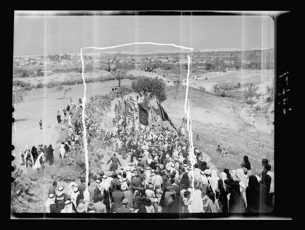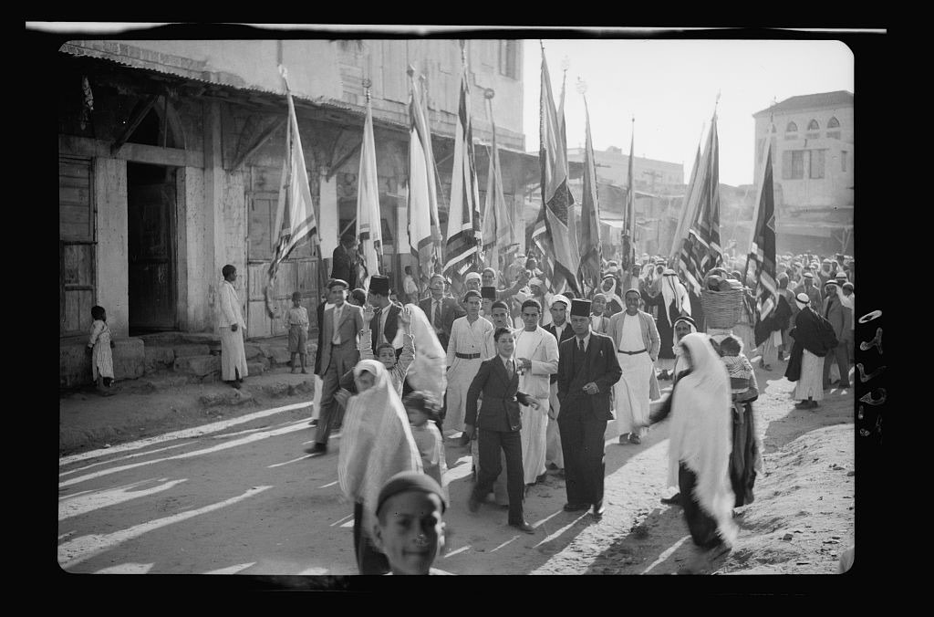 مسيرة تنطلق من أحياء المجدل باتجاه مشهد الحسين - 21 نيسان 1943 (المصدر: مكتبة الكونغرس)